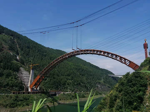 该桥为非对称上承式钢管混凝土拱桥,主跨292米,在同类型桥梁中居世界第一,采用跨度865米的2×150吨缆索起重机,在国内首次实施两片拱肋同时整节段吊装,主拱于2019年7月31日合拢。