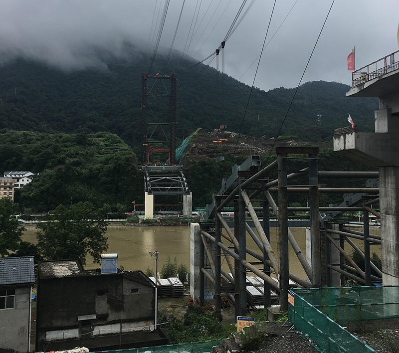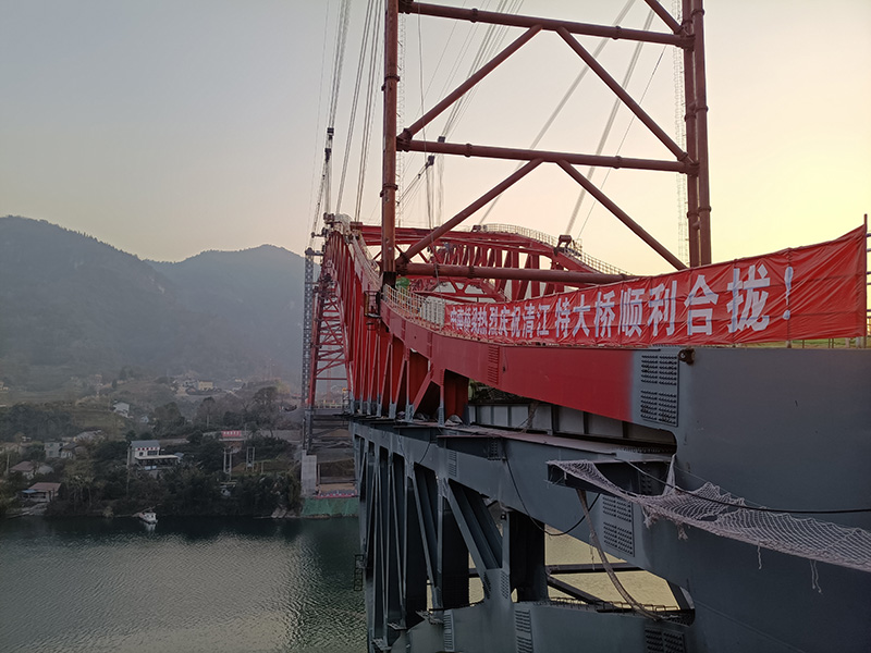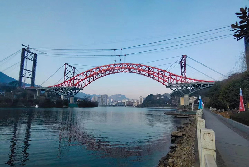 湖北长阳清江特大桥全长354.8m,主桥为320m飞燕式钢桁架系杆拱桥,采用2*80吨缆索吊机安装,主拱于2021年1月14日合龙。