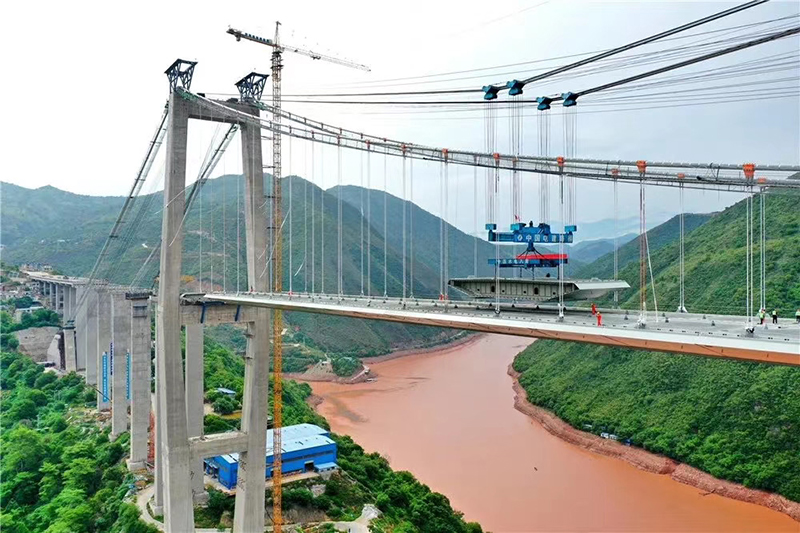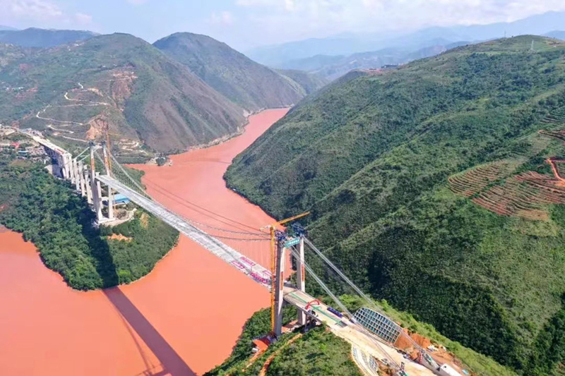 红河全长1280公里,是一条跨越中国和越南的国际河流。红河特大桥为跨越红河南沙水库而建,是我国首座跨越红河的高速公路悬索特大桥,大桥全长1366米,其中建水岸引桥长580米,元阳岸引桥长80米,主跨长700米。库区水面距桥面高达184米,建水侧主塔高181.29米,元阳侧主塔高122.5米。2020年9月5日,红河特大桥主跨成功合龙,标志着全线工程建设取得重大节点性胜利。