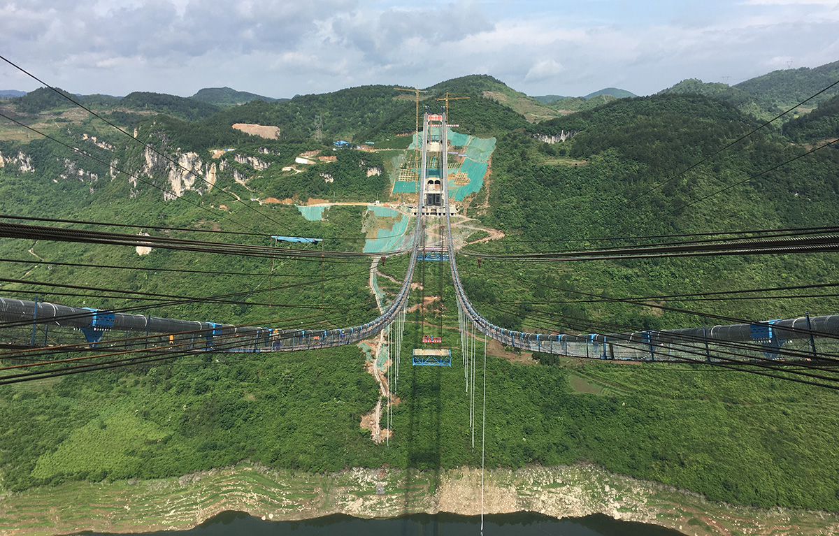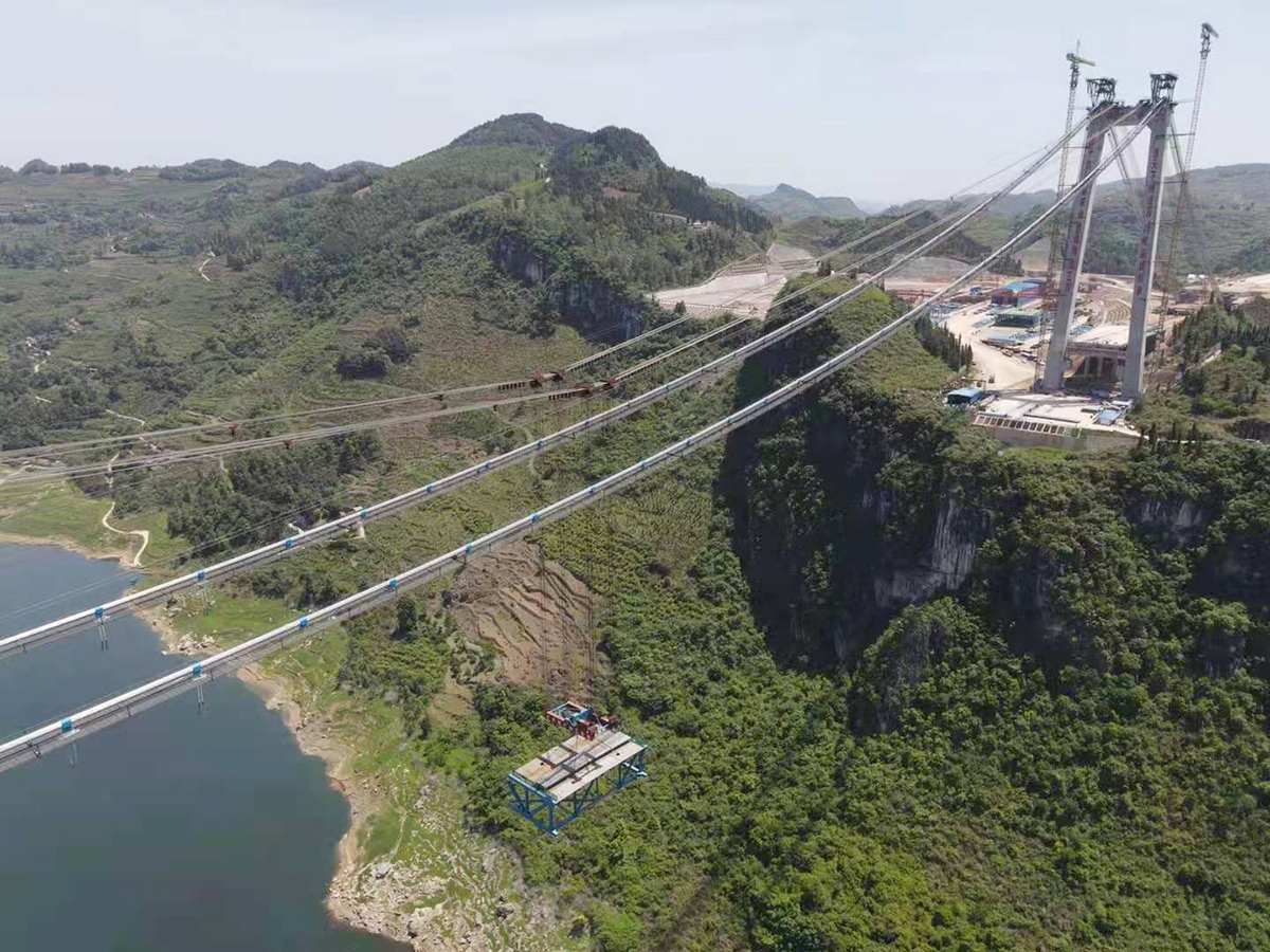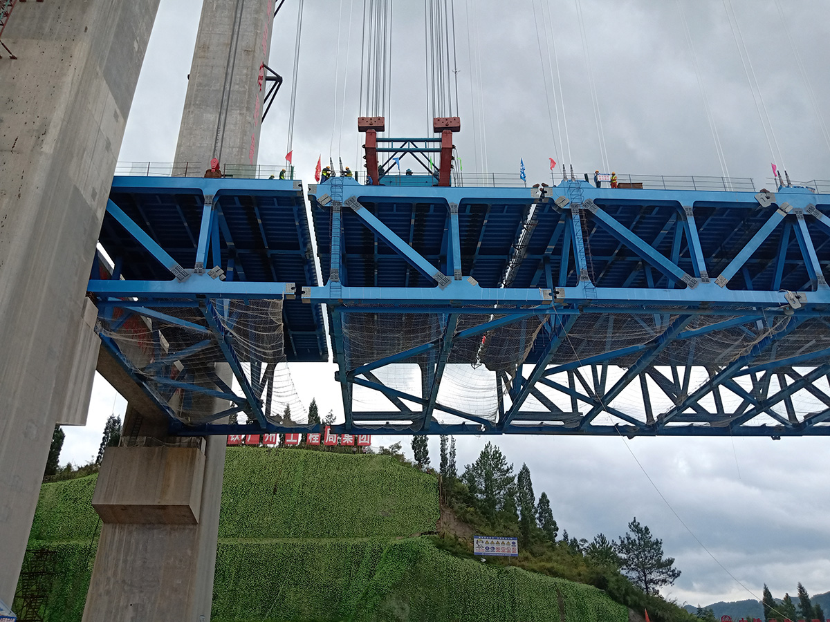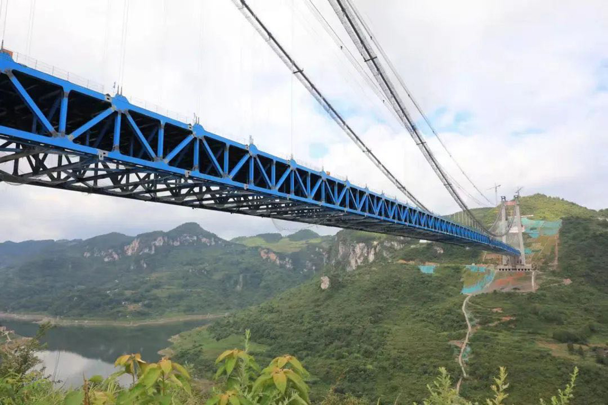 瓮开高速开州湖特大桥,为主跨1100米的双塔单跨钢桁梁悬索桥,全长1257米,主塔高139米。采用2×125吨缆索吊进行安装,于2021年8月17日合龙。