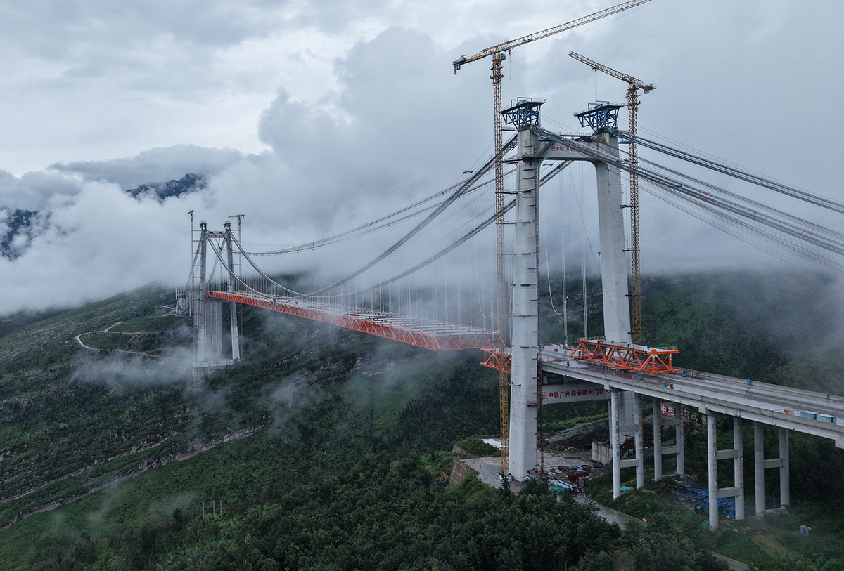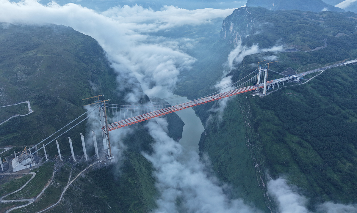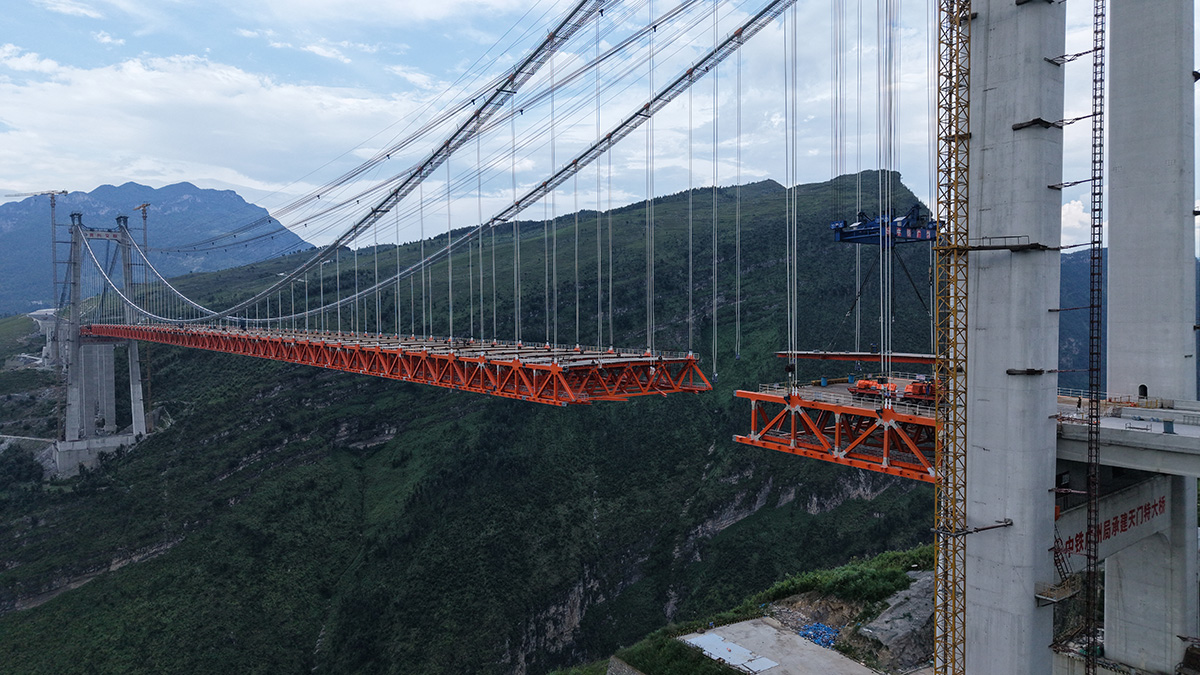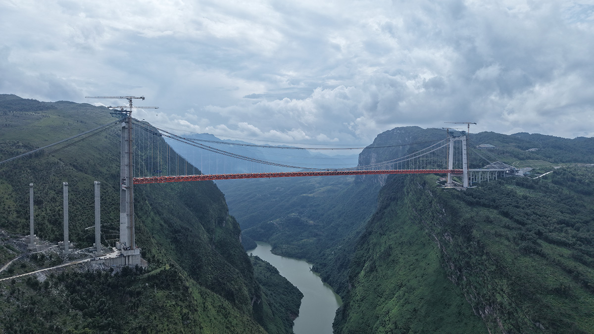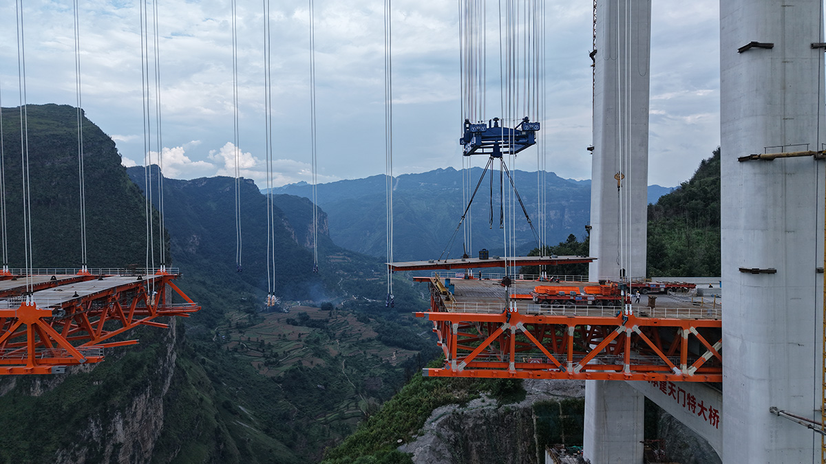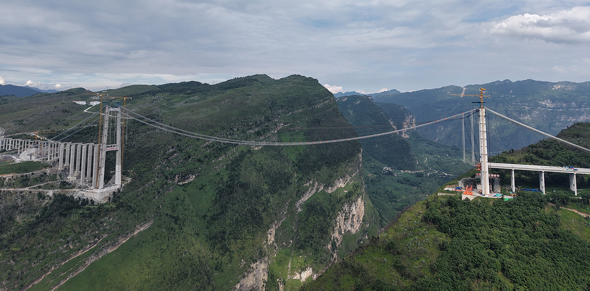 该桥为主跨820米的钢桁梁悬索桥,全长1553米,桥面至江面高度差达560米,是安盘高速公路全线控制性工程之一,采用260t缆索起重机进行安装,2025年9月23日合龙。