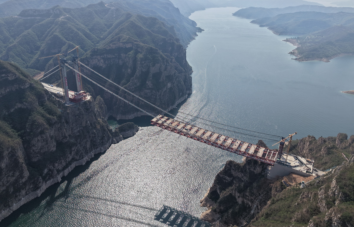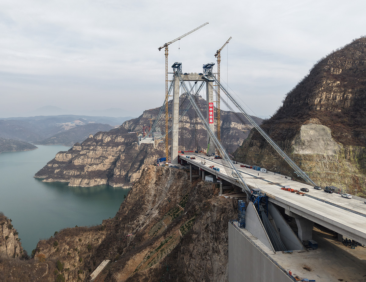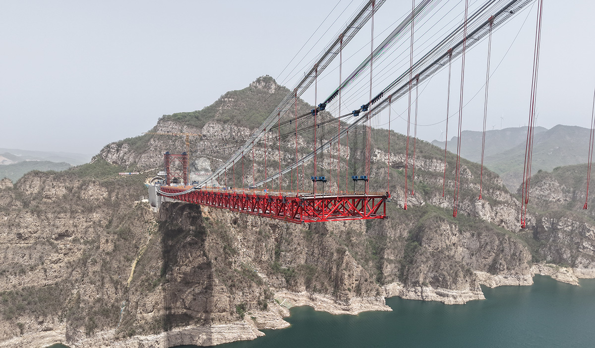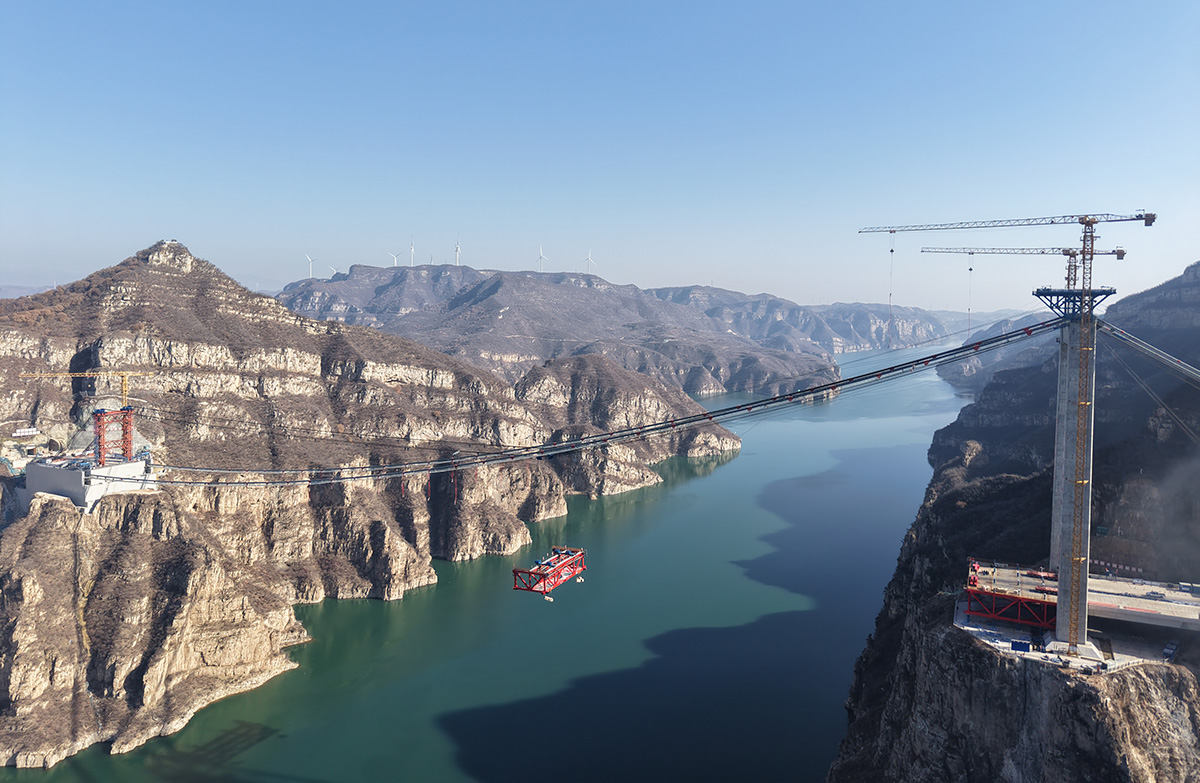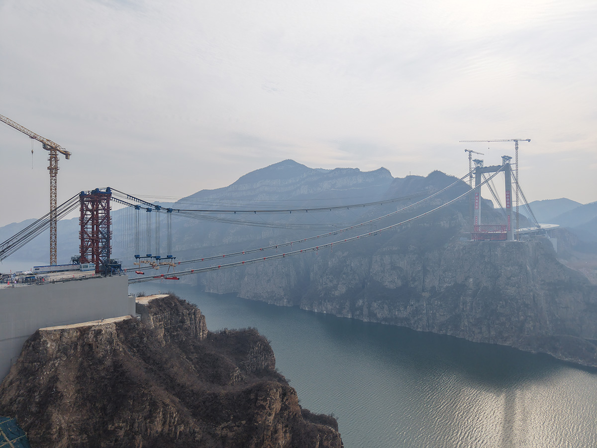 该桥为主跨555米的独塔单跨地锚式回转缆悬索桥,全长1688.5米,采用2×145t缆索式起重机进行安装,2025年6月10日合龙。